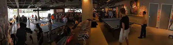 The concept of SPiN was inspired by popular table tennis parties (called "Naked Ping Pong") held regularly by SPiN co-founders Bricklin, Raharinosy, and Green along with Kazuyuki Yokoyama.[2] SPiN franchises incorporate full-service bars and restaurants along with their ping pong tables. The ping pong tables can be reserved by customers (including a "center court" table at many locations)[5][6] who then play for an hourly cost (or purchase a membership).[7] Location openings have often included celebrity appearances and professional table tennis players.[7][11] Sarandon and SPiN brand ambassador Soo Yeon Lee have also promoted the chain.[14][15] The chain has partnered with organizations such as the Glide Foundation to help provide access to table tennis to youth who might be otherwise unable to play.[9]