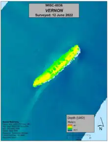 A wreck, possibly that of Vernon was found in 1908 by two fishermen, 8 miles (12.9 km) north of Two Rivers, Wisconsin, 5 miles (8.0 km) off shore in 300 feet (91.4 m) of water.[26] The wreck of Vernon was located in 1969 by Kent Bellrichard of Milwaukee, Wisconsin.[27] She rests intact in 210 feet (64 m) of water, northeast of Two Rivers. She is keeled over to starboard side. Her pilot house and cabins which broke away when she sank, lie west of her wreck in 160 feet (48.8 m) of water.[2][4] Her cargo is still intact within her hold.[28] Her gangways are still open, confirming Axel Stone's claims of her crew not being able to close them due to her excessive load. Various artefacts, including her name board are on display at the Rogers Street Fishing Village in Two Rivers.[2][4][8][29]