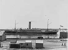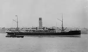 Yongala began her delivery voyage from Southampton in England on 9 October 1903.[10] She sustained some damage in heavy weather crossing the Bay of Biscay,[7] called at Las Palmas and Cape Town,[8] and on 24 November reached Fremantle.[7] When she continued her voyage from Fremantle to Adelaide, it was alleged that she raced the Orient Steam Navigation Company mail ship RMS Orizaba, and that Yongala won the race.[11] The Adelaide Steamship Company publicly denied that any race took place.[12] On 30 November she reached Port Adelaide, where Adelaide Steamship Co shareholders inspected her.[13] She reached Melbourne on 3 December[8] and Grafton Wharf[6] in Sydney on 6 December.[14]