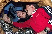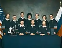 ![]() Left to right – Seated: Dezhurov, Gibson, Solovyev; Standing: Thagard, Strekalov, Harbaugh, Baker, Precourt, Dunbar, Budarin | |