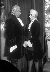 Guitry developed a charming, witty stage persona, often appearing in period-dress light comedies, for instance his 1925 pastiche Mozart, about the young Wolfgang Amadeus Mozart on a visit to Paris. To compose the score he approached André Messager, with whom he had successfully collaborated in 1923 on a show for Printemps, L'amour masqué.[20] Messager was unavailable and recommended the composer Reynaldo Hahn, who accepted the commission. The resulting production took some liberties with historical accuracy, but it proved highly popular.[21] Printemps, in a breeches role, played and sang the young Mozart, with Guitry as the composer's patron, Baron Grimm. Gielgud recalled, "She seemed ravishingly youthful and touching in her powdered wig, black knee breeches and buckled shoes, while Sacha hovered over her with avuncular authority, not attempting to try to sing himself, but contributing a kind of flowing, rhythmic accompaniment with his speeches, delivered in a deep caressing voice."[17] After playing successfully at the Théâtre Edouard VII,[22] the company presented the piece for a three-week season in London in June and July 1926.[23] [n 2] After the London production, Guitry and Printemps took the piece to Broadway, Boston and Montreal in late 1926 and early 1927.[25] They returned to the US and Canada in 1929.[26]