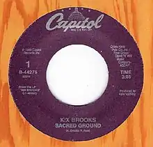 "Sacred Ground" is a country music song, co-written and originally recorded by American country music singer Kix Brooks, prior to his joining Ronnie Dunn in the duo Brooks & Dunn. Brooks' version was issued in 1989 as a single, and was included on his 1989 self-titled debut album.