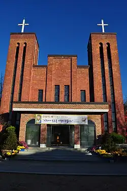 The colored brick clad building is adorned with 2 two identical towers topped by crosses. The temple follows the Roman or Latin rite and is the principal church of the Diocese of Masan (Dioecesis Masanensis; 마산 교구) that was created by Pope Paul VI in 1966 by bull "siquidem catholicae".