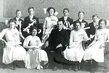 In 1909, the school had 85 students and a graduating eighth-grade class of nine. In 1917, the nuns' salary was $1.00 per school day. In 1918, during the Spanish Influenza, Fr Haarth noted "Something that never happened in the history of the Catholic Church in this State took place on the Sundays of the 7th and 14th of October [in 1918]: namely, the church was closed and no public services were held on account of influenza epidemic; the school was closed for three weeks at the same time."[4] A little over 100 years later, the school would once again be temporarily closed due to a pandemic.