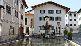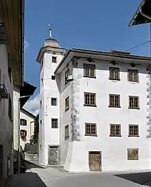 The Türelihus (Türeli House) is located in the center of Valendas and is one of the most historically valuable houses in the village. The interior contains many of the original furnishings from the Renaissance and Baroque eras. The original building was constructed in 1485. In 1554 it was expanded, this expansion was known as the Renaissance phase, with a spiral staircase within a tower and a stable was added to the north side. In 1775 it was renovated in the baroque style. The four-story building was abandoned for many years and had begun to decay. In 1994, the first attempt to renovate this building ended with only the addition of a temporary roof.[17]