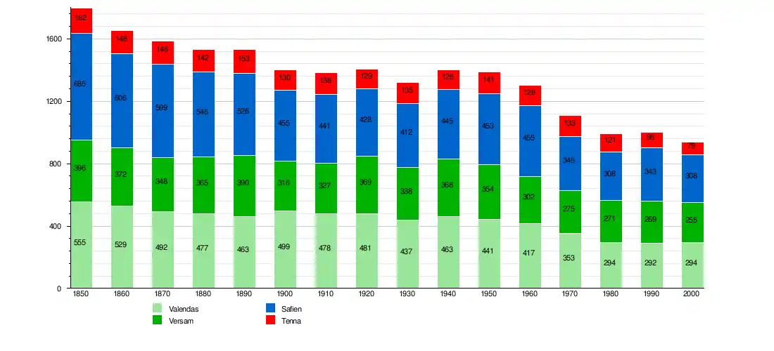 Valendas is first mentioned in 765 as in Valendano.[4] Versam is first mentioned in 1050 as a valle Versamia.[5] Safien is first mentioned in 1219 as Stosavia.[6] Tenna is first mentioned in 1398 as Thena.[7]