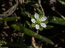 Sagina maxima is a species of flowering plant in the family Caryophyllaceae known by the common names stickystem pearlwort[1] and thick-stemmed pearlwort. It is native to the west coast of North America from Alaska to California, where it can be found in many types of sandy and rocky coastal habitat. It is a small, fleshy perennial herb growing in a clump of linear leaves and thick stems. The fleshy, pointed leaves are 1 or 2 centimeters long. The inflorescence is a solitary flower with five sepals and five small white petals. There are two subspecies which differ mainly in the arrangement of hairs on the stem.
