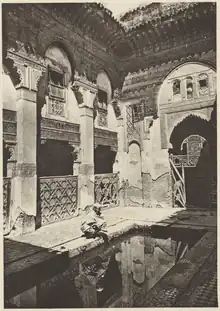 According to its foundation inscription, the madrasa was originally known as al-Madrasa al-Kubra (the "Greater Madrasa") because it was larger than the other madrasas of the same era.[4][7] It also marked a significant evolution in the richness of its decoration, and features some of the earliest zellij (mosaic tilework) to be found in any Moroccan madrasa.[2][7] It was reported that the madrasa's construction had cost 100,000 gold pieces.[3] Later it came to be known as the Madrasa as-Sahrij for the iconic sahrij (water basin) in the center of its courtyard (sahn). Abu al-Hassan also built another smaller madrasa adjoining it, commissioned in 1323 and initially known as the al-Madrasa es-Sughra (the "Lesser/Smaller Madrasa").[8][3] That madrasa later came to be known as the Madrasa as-Sba'iyyin (roughly: "Madrasa of those who teach the Seven Recitations of the Qur'an"), the name it still has today, presumably due to the madrasa's specialization in this subject.[3][9] Together, these two madrasas provided both lodging and teaching for students studying at the nearby Andalus Mosque, much as the Seffarine and al-Attarine Madrasas served students at the al-Qarawiyyin Mosque across the river.[3][8][2] The madrasas were also accompanied by another funduq or hospice, but it has since disappeared.[7]