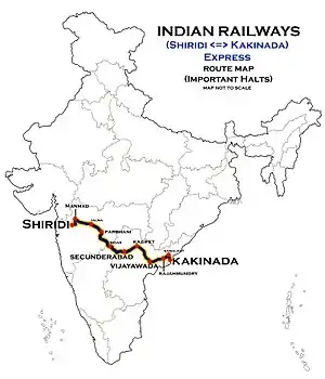 The 17205/17206 Sainagar Shirdi–Kakinada Port Express runs from Sainagar Shirdi via Kopargaon, Manmad Junction, Nagarsol, Aurangabad, Parbhani Junction, Parli Vaijnath, Latur Road Junction, Bidar, Vikarabad Junction, Lingampalli, Secunderabad Junction, Kazipet Junction, Khammam, Vijayawada Junction, Eluru, Rajahmundry, Samalkot Junction, Kakinada Town to Kakinada Port.