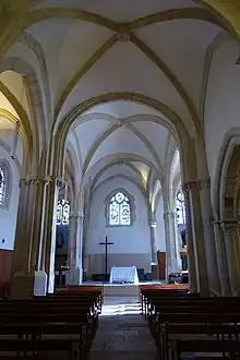 The church sits on a layer of clay and the site is steeply sloped.[3] As a result, it has always had problems with instability. In 2009, major cracks appeared in the masonry on the right side of the church and the church was immediately closed.[2] Large-scale stabilization work, employing the technique of jet grouting, was subsequently undertaken, preceded by an archaeological excavation.[4] The excavation revealed a mass burial ground from the Carolingian period as well as a semi-circular chevet from the second half of the 12th century. Around this chevet, 45 skeletons were found, half of which were of babies.[2]