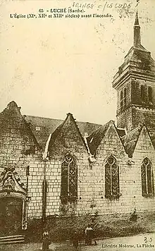 In the Actus pontificum Cenomannis, Luché is listed among the seventeen parishes founded by Saint Liboire, Bishop of Le Mans, in the 4th century,[1][2] making it one of the oldest parishes in Maine.[3] The location of the site is certainly linked to the presence of a ford to cross the Loir at this point.[3] No trace remains of this first sanctuary, probably dedicated to Saint Apolline, apart from the name of the square adjoining the church to the south, and its well which is fed by a spring originating beneath the building's choir.[1]