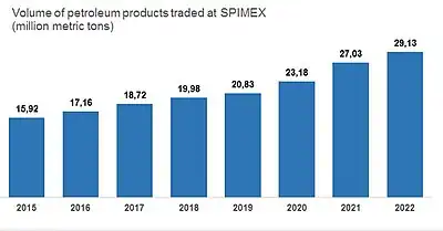 - ↑ "Volume of petroleum products traded at the Saint Petersburg International Mercantile Exchange (SPIMEX) in Russia from 2015 to 2021(in million metric tons)". Statista.