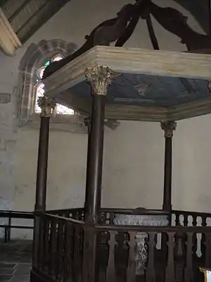 The sacristy was constructed in 1686 by a team of workers led by Guillaume Le Tauc. The master carpenter was a Paul Le Goff. The baptismal fonts are located by the "chapelle des Trépassés".[4]