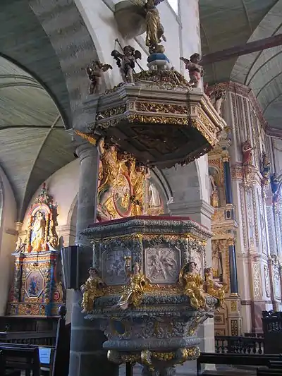 The baroque pulpit in the Notre-Dame church at St Thégonnec dates to 1683 and was the work of the sculptors François and Guillaume Lerrel, father and son, from Landivisiau. They carved four female Caryatides representing the Cardinal virtues; Prudence, Temperance, Justice and Fortitude to support the canopy and added panels depicting the Four Evangelists with their attributes around the base. Further relief panels decorate the balustrade of the stairway these depicting the Church Fathers of the Western church, Ambrose, Jerome, Augustine and Saint Gregory the Great. He also added a relief panel depicting Moses receiving the Ten Commandments to the area between the caryatides. Many angels are included in the decoration and at the summit a "renommé" stands a foot poised on a globe and playing a trumpet. The sounding board ("l'abat-voix") is positioned behind the pulpit and dates to 1722.[4]