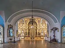 The pyramidal bell-tower, attached to the church by a refectory, was built in two tiers in 1784-86 and formerly boasted ten bells, the largest of which weighed in excess of four tons. The top of the belfry was remodeled in 1850. Seven years later, the cathedral interior was renovated and the 18th-century icon screen augmented. Furthermore, when the first permanent bridge across the Neva was built in the 1850s, a chapel on the bridge became affiliated with the cathedral.