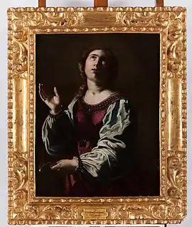 The painting depicts Saint Apollonia, a martyr who died in Alexandria during an uprising against Christians in A.D. 249.[1] The portrait shows the saint from the waist up, against a dark background, looking up, as if skyward. Her left hand extended upward, while her right hand is carrying a pair of tweezers with a tooth, an iconographic attribute that helps identify her as Apollonia.[2]