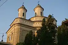There was a graveyard outside the church; part of the remains were disinterred after Eternitatea cemetery was established in 1871, an exception being Gheorghe Leondari, who was buried there after his death in 1835. A hundred years later, his remains were placed in the church, on the right side of the nave.[2] Also in 1935, the church was blessed a second time by Metropolitan Nicodim Munteanu. An athenaeum associated with the church was built in the yard in 1934.[2] This hosted cultural figures, among the most popular speakers being philosopher Ion Petrovici.[1] It was destroyed during World War II.[2] After the 1977 Vrancea earthquake, the damaged spires were rebuilt in 1997-1998 and the interior repainted in 1987-1989.[1][2] During the same period, the Miclăușeni Monastery donated part of Saint Charalambos' relics to the parish. Following the Romanian Revolution, a bakery and food pantry were established at the church.[1]