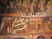 Upper floor is full of frescoes. On the ceiling, there are figures of Abraham, Isaac, Jacob, Moses, Christ, Solomon and David. On the south wall, Baptism of Christ, Last supper, Kiss of Judas were depicted. The frescoes on the north wall are depictions of Virgin Mary, Mary Magdalene and another woman by Christ's body. On the other walls, scenes from the Bible and history such as Saint George and Saint Theodore, Satan, Emperor Constantine and his mother were depicted.[2]