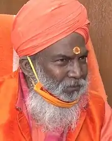 Sachchidanand Hari Sakshi was born in Sakshi Dham, Kasganj district, Uttar Pradesh. His father was Atmanandji Maharaj Premi and mother was Madalasa Devi Lodhi.[7] Sakshi belongs to the Lodh community which has been categorised as an Other Backward Class in Uttar Pradesh.[8] Initially, Sakshi belonged to the BJP and had close associations with Kalyan Singh, another BJP leader belonging to the Lodh community, and another BJP leader Kalraj Mishra.[9][10][11] He was elected to the Lok Sabha in 1991 from Mathura, 1996, and 1998 from Farrukhabad which has a Lodh majority.[9][12][13] Sakshi Maharaj has been involved in the Ram Janmabhoomi movement and is currently under trial as one of the accused in the Babri Masjid demolition case.[1][14]
