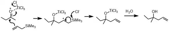 [4] The Hosomi-Sakurai reactions are allylation reactions which involve use of allyl silanes as allylmetal reagents. This section demonstrates examples of allylation of diverse ketones. In figure 1, allylation of a carbonyl ketone (compound containing a ketone group and two different functional groups) has been shown. In the given reaction, the electrophilic compound (carbon with a ketone group) is treated with titanium tetrachloride, a strong Lewis acid and allyltrimethylsilane. According to the general principle, the Lewis acid first activates the electrophilic carbon in presence of allyltrimethylsilane which then undergoes nucleophilic attack from electrons on the allylic silane.[5] The silicon plays the key role in stabilizing the carbocation of carbon at the β-position. Hosomi-Sakurai reaction is also applicable for other functional groups such as enones, where conjugate addition is usually seen. In figure 2, the Hosomi- Sakurai reaction has been shown using a cinnamoyl ketone. This reaction follows the same mechanism as the previous reaction shown here.