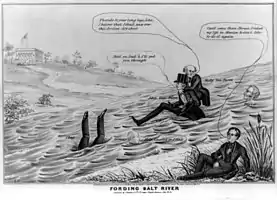 - In the pro-Democrat cartoon "Fording Salt River", the White House is seen in the backdrop of the cartoon, while the river cuts towards the center of the image. Two Whig candidates, Henry Clay and Zachary Taylor, and supporter Horace Greeley are depicted to be tossed around in the currents of the river with Clay submerged upside down underwater, while Democrat Martin van Buren rides swiftly on the back of his son John.[9]