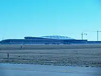 The eastern end of the Sam Jones Expressway is at the signalized intersection of South Tibbs Avenue and Raymond Street.[1] East of that intersection the road is named Raymond Street. The western endpoint is a signalized "T" intersection on the grounds of the Indianapolis International Airport, at what was the main entrance to the now-demolished former passenger terminal. Between these two points are traffic interchanges with I-70 (partial), Lynhurst Drive (full), Executive Drive (partial), and I-465/I-74 (full). There is also a grade separation at Roena Street. The road serves pre-move airport hotels based by the old terminal site that remain open and use I-465 and I-70 or High School/Perimeter Road to provide private shuttle service to the new terminal.