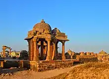 In Sikhism, the term "samadhi" is used for the mausoleums of eminent figures, both religious and political. Examples include the Samadhi of Ranjit Singh in Lahore, and that of Maharaja Sher Singh near Lahore. Hindu equivalents are usually called chatri, although those for Maratha Empire figures also often use "samadhi". The forms of structure called "samadhi" vary greatly. The word is sometimes used for a memorial stele, also called paliya, a type of hero stone once common in parts of Gujarat and Sindh. It may be used for small memorial buildings such as open chatri, often placed around a temple.