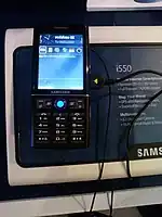 The Samsung SGH-i550w is a mobile phone from Samsung[1][2] that belongs to their infotainment class. It has both Wi-Fi and 3.5G connectivity. It can play various multimedia formats. It has a 3.2 megapixel camera. It runs on S60 software, 3rd Edition, Feature Pack 1.