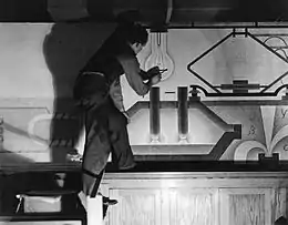 WPA muralist Eric Mose at work on his fresco, Power (1936), in the library of Samuel Gompers Industrial High School for Boys