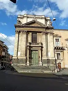 A convent was completed by 1640. This church and convent were severely damaged by the 1693 earthquake, and reconstruction began in the next century with the patronage of Vincenzo Paterno Castello.[1] In 1866, the order was suppressed and the former convent, found to the right of the church facade, was used by the military. After having the buildings restored to the Dominicans, in 1904 the monks built in a new convent wing behind the church.[2] In the city of Catania, there was a second Dominican convent, this one for women, dedicated to St Catherine of Alexandria.[3]