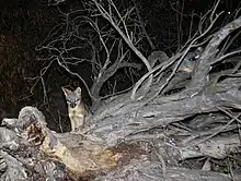 Recently, gray foxes (Urocyon cinereoargenteus) have been documented near the mouth of San Francisquito Creek (see photo) and on the Palo Alto Golf Course. Populations of gray fox have increased in the South Bay since the U.S. Fish and Wildlife Service has culled non-native red foxes (Vulpes vulpes) because the latter prey on the endangered California clapper rail (Rallus longirostris obsoletus).[41] Genetically, gray fox are the most basal of all canids.[42]
