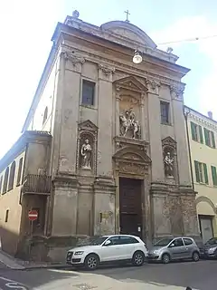 A church at the site is documented by 1127, with the prior belonging to the Benedictine Abbey of Polirone. The simple church underwent major reconstruction from 1680 to 1693 using designs of the Flemish architect and painter Frans Geffels. The vertical façade is highly encrusted with decoration, and has three niches with stucco 18th century statues depicting St Martin donating cloak to poor (center) and Saints Peter and Paul. The interior also has an elaborate stucco decoration in the style of Michele Costa, as well as a large canvas by Gian Francesco Tura of a Madonna with Child with Saints.