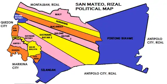San Mateo, officially the Municipality of San Mateo (Tagalog: Bayan ng San Mateo), is a 1st class urban municipality in the province of Rizal, Philippines. According to the 2020 census, it has a population of 273,306.