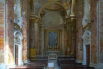 The architecture of the interior is characterized by a quite sober but evident baroque style with decorative effects based on the use of white and pink marbles.