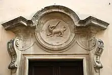 The portal of the church, in sandstone, has a dog with a candle in its mouth in bas-relief in the tympanum, a play on the phrase Domini canes, or ("Hounds of the Lord"). On the side of the main entrance there is access to the cloistered convent.[1]