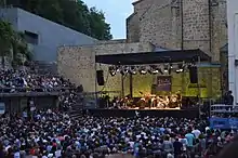 Plaza de la Trinidad (Trinity Square), a square in the old town at the foot of Mount Urgull, was chosen as the main location of the Festival. This square was built in 1963, designed by the architect Peña Ganchegui to commemorate the centenary of the demolition of the city walls. Plaza de la Trinidad has been the main focus of the festival since then. The small area means that the audience is close to the stage, but in the mid-1970s more famous artists started to perform at Jazzaldia, so more spacious venues were needed, and the shows were moved to Anoeta Velodrome and the Sports Hall.