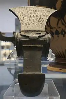 The San Sosti Axe-Head is an ancient bronze head of an axe that was originally found near the town of San Sosti, in the province of Cosenza in Calabria, southern Italy. Based on its Ancient Greek inscription, it is now considered to be an elaborately crafted votive offering to the gods.[1]