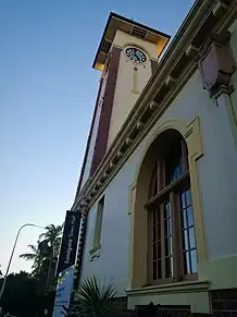 The Town Hall was opened on 21 September 1912 by the Queensland Governor, William MacGregor, at a ceremony attended by 500 people.[4] A four dial clock, acquired from the Old Ipswich Town Hall by a Brisbane watchmaker, Frederick John Bright, was installed in the clocktower in 1923. The clock is reputedly one of the oldest working clocks in Brisbane, built by Gillet and Johnstone of Croydon, England in 1877.[1]