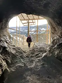 The Sandias contain a location notable for prehistoric archaeology: the Sandia Cave was believed by some in the 1930s to the 1950s[13] to have been inhabited 10000 to 12000 years ago by the "Sandia Man," a cultural classification that is no longer used.[14] The cave can be accessed via a 1/2 mile trail in Las Huertas Canyon, on the northeast side of the range, near Placitas, New Mexico.