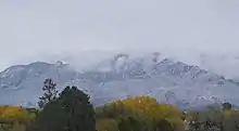 The Sandia Mountains (Southern Tiwa: Posu gai hoo-oo, Keres: Tsepe, Navajo: Dził Nááyisí; Tewa: O:ku:p’į, Northern Tiwa: Kep’íanenemą; Towa: Kiutawe, Zuni: Chibiya Yalanne)[1] are a mountain range located in Bernalillo and Sandoval counties, immediately to the east of the city of Albuquerque in New Mexico in the southwestern United States. The mountains are just due south of the southern terminus of the Rocky Mountains, and are part of the Sandia–Manzano Mountains. This is largely within the Cibola National Forest and protected as the Sandia Mountain Wilderness. The highest point is Sandia Crest, 10,678 feet (3,255 m).