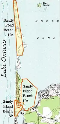 Sandy Pond Beach Unique Area is a 76-acre (31 ha) New York State conservation area located within the eastern Lake Ontario dunes. It lies at the north end of a spit of land dividing North Sandy Pond from Lake Ontario, and is about two miles (3.2 km) north of the developed portion of Sandy Island Beach State Park.[2] There is no road access to the area, which can be most easily reached by boat. For this reason, local residents have long referred to the beach as "Boaters' Beach". It has been managed as part of Sandy Island Beach State Park since 2011.