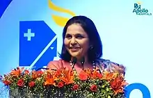 Sangita Reddy is Joint Managing Director of Apollo Hospitals Enterprises[1] and the president of Federation of Indian Chambers of Commerce & Industry (FICCI).[2] She was elected as a Member of the Steering Committee on Health for the Twelfth Five Year Plan (2012-2017) by the Planning Commission, Government of India.[3] She successfully spearheaded many of the sectoral and industrial initiatives of the FICCI's State Council from 2010 to 2016. She was formerly the chairperson for the FICCI Health Care Committee, New Delhi,[4] and a member of the Rockfeller Working Group, where she was responsible for private healthcare development.[5] She is board member of several organizations.[6]