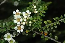Sannantha crenulata, commonly known as fern-leaf baeckea,[2] is a species of flowering plant in the myrtle family, Myrtaceae and is endemic to a restricted part of Victoria in Australia. It is an erect shrub with egg-shaped to round leaves with scalloped edges, and groups of usually 3 white flowers arranged in leaf axils.