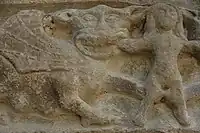 The entrance features a pointed frontispiece with four sloping archivolts supported by fluted columns with original capitals, a lintel and a pediment. The capital on the left features a floral pattern while the right, two devouring monsters, a type of winged lion that swallow a person whole. The lintel at the center features a small rhomboid emblem in bas-relief depicting tools of the trade of the master of the house.