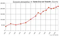 In 1990, the population peaked above the 200,000 mark. Santa Cruz de Tenerife and the city of San Cristóbal de La Laguna form a continuous urban area, with a combined population of over 380,000 inhabitants.[24][25]