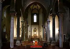 The architecture of the church mixes late Renaissance style and Gothic-Catalan style, the latter especially visible in the three-part arcaded loggia located at the top of the entry staircase (added in 1845). The interior is also late Gothic, and includes a canvas depicting Nativity with Adoration of the Shepherds (17th century) by an unknown master, and 16th-century bas-reliefs attributed to Vincenzo and Antonello Gagini, who also sculpted the capitals of the columns and the entrance portals. Traces of frescoes by Olivio Sozzi remain in one of the chapels.