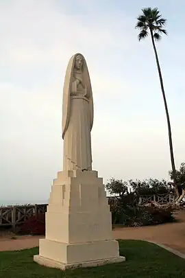 The cast-cement sculpture of Saint Monica of Hippo is approximately 10 ft (3.0 m) tall and rests on a concrete base that is approximately 6 ft (1.8 m) tall.[3][4] (Father Juan Crespí visited the nearby Tongva Sacred Springs on an expedition in 1769; the scattered pools of flowing water reminded him of Monica’s tears for her son Augustine, of later Confessions fame.[5] The pre-statehood Rancho Boca de Santa Monica and Rancho San Vicente y Santa Monica, and eventually the city, all took the name of the Roman Catholic Saint.)