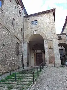 The monastery of Clarissans of the third order was founded in 1562 by Suora Eusebia Borghese, a nun who had fled Siena during it siege by Florentine forces. Having made her way to Rome, then to Loreto, she was commissioned by the local aristocrat Paolo Orsini and bishop Pier Donato Cesi to establish a monastery in Narni, dedicated to the Ancient Roman martyr, Restituta. The church had been previously a parish church for the community. Upon the death of Borghese in 1590, the situation of the convent was dire, given the poverty of the nuns. An endowment by the Marquis of Riano, Paolo Emilio Cesi, alleviated the financial difficulties. He visited the site in 1604, and endowed the church at the cost of 400 gold scudi with an altarpiece depicting the Visitation of St Elizabeth,[1] attributed to the Cavaliere d'Arpino.[2] He also endowed the church with a number of silver and gilded sacramental objects, including a crucifix, candelabra, and a eucharist home.[3] Finally the church also acquired an altarpiece depicting putatively the Birth of St John the Baptist, attributed to Antonio Gherardi. The painting derives from the razed church of San Giovanni Decollato.[4]