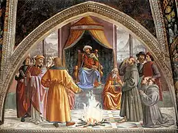 This scene is located on the upper right wall. It portrays St. Francis preaching to the Ayyubid sultan Al-Kamil, who asked him to walk over a fire to demonstrate his sanctity. The piece is rather similar to that of Giotto in Santa Croce with the sultan in the middle, St. Francis on the right with his brother friars, but with Ghirlandaio's innovation of a figure in the foreground whose back is to the observer. It is one of the best executed parts of the cycle.