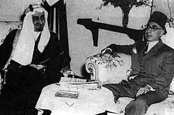 A Syrian mission was opened in Saudi Arabia in 1941, when Syria was still under the control of the French Mandate.[4] King Abdulaziz reportedly supported the independence of Syria and Lebanon from both the Hashemite dynasty and the French mandate.[4] Syria recognized Saudi Arabia as a sovereign state in 1944.[5] The King met Shukri Al Quwatli, the first president of independent Syria, on 17 February 1945 in Al Fayyum, Egypt.[4] Both Saudi Arabia and Syria were founding members of the Arab League which was established in March 1945.[6]